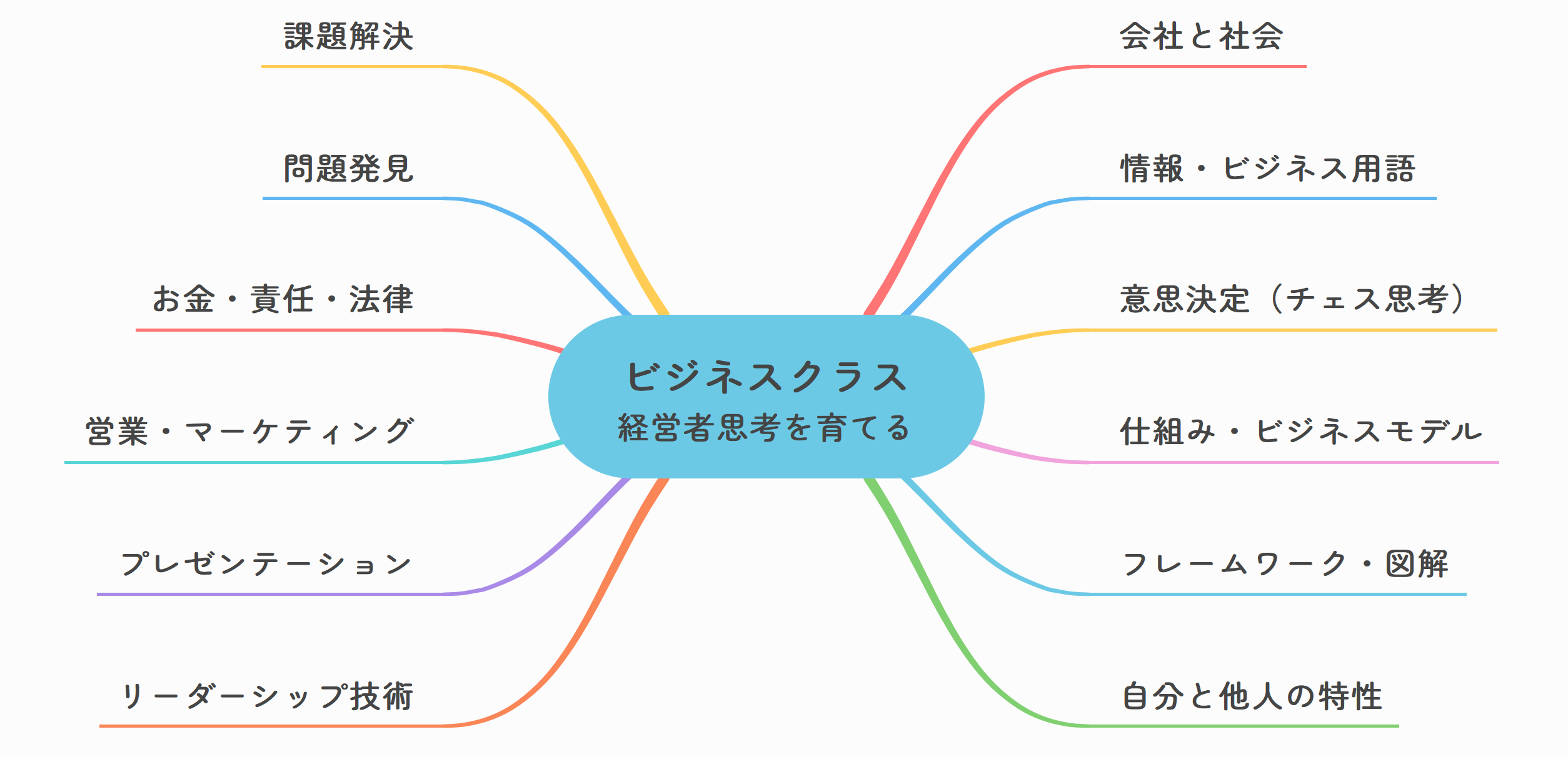 後半では、人を動かす技術、考えを伝える技術、価値をどう届けるかというマーケティングの視点、そしてお金・法律・投資といった現実的なテーマにも踏み込みます。最終的に目指すのは、「世の中の違和感に気づき、自分ならどう解決するかを考えられる状態」。身近な問題を、感情だけで終わらせず、ビジネス的・社会的に整理し、自分の言葉で形にするところまで取り組みます。